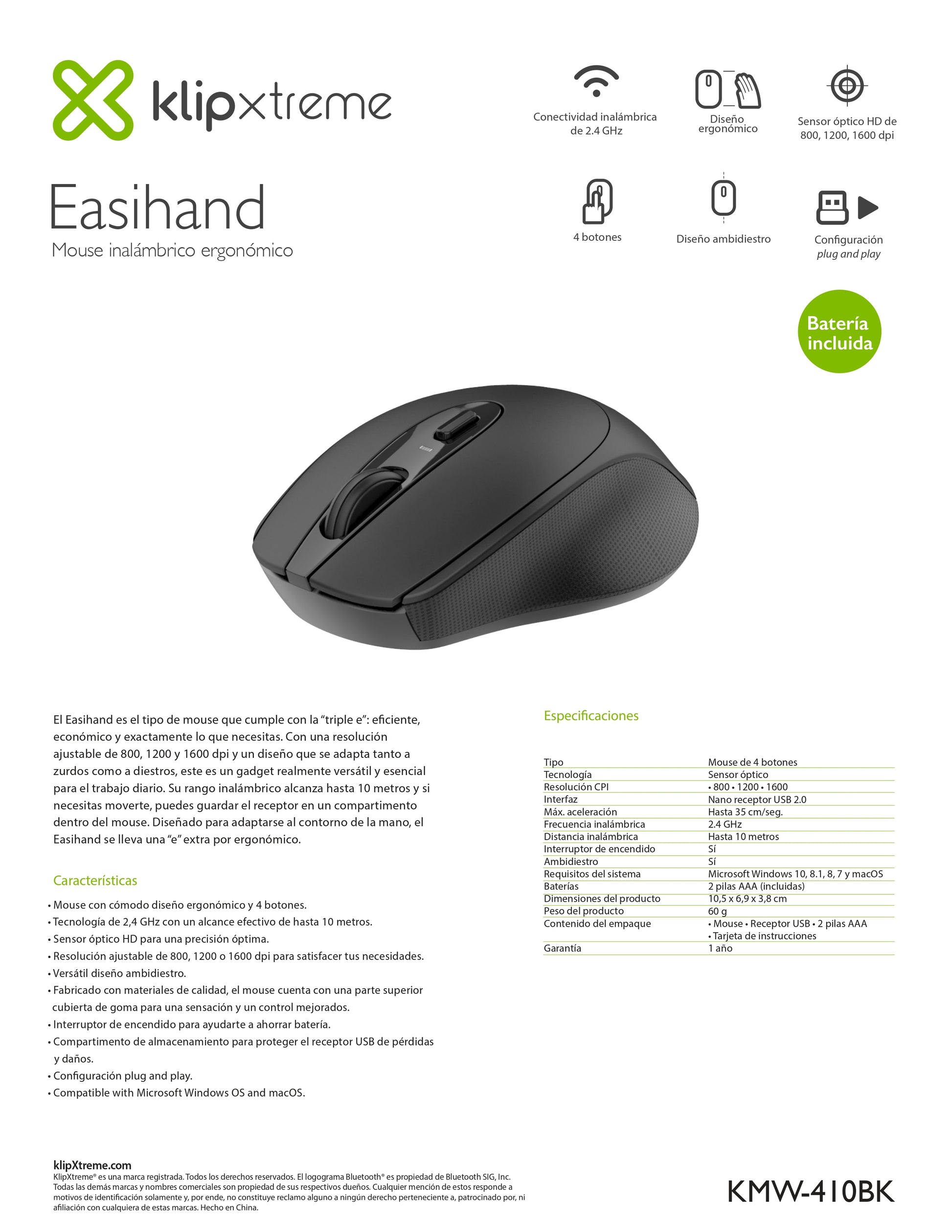 Este ratón inalámbrico Klip Xtreme KMW-410BK ofrece conectividad estable a 2.4 GHz mediante un nano dongle, garantizando libertad de movimiento sin interrupciones. Su diseño negro elegante y compacto facilita su uso en cualquier entorno, mientras que su tecnología inalámbrica asegura precisión y comodidad para tareas diarias o profesionales. Ideal para quienes buscan un dispositivo confiable y eficiente.