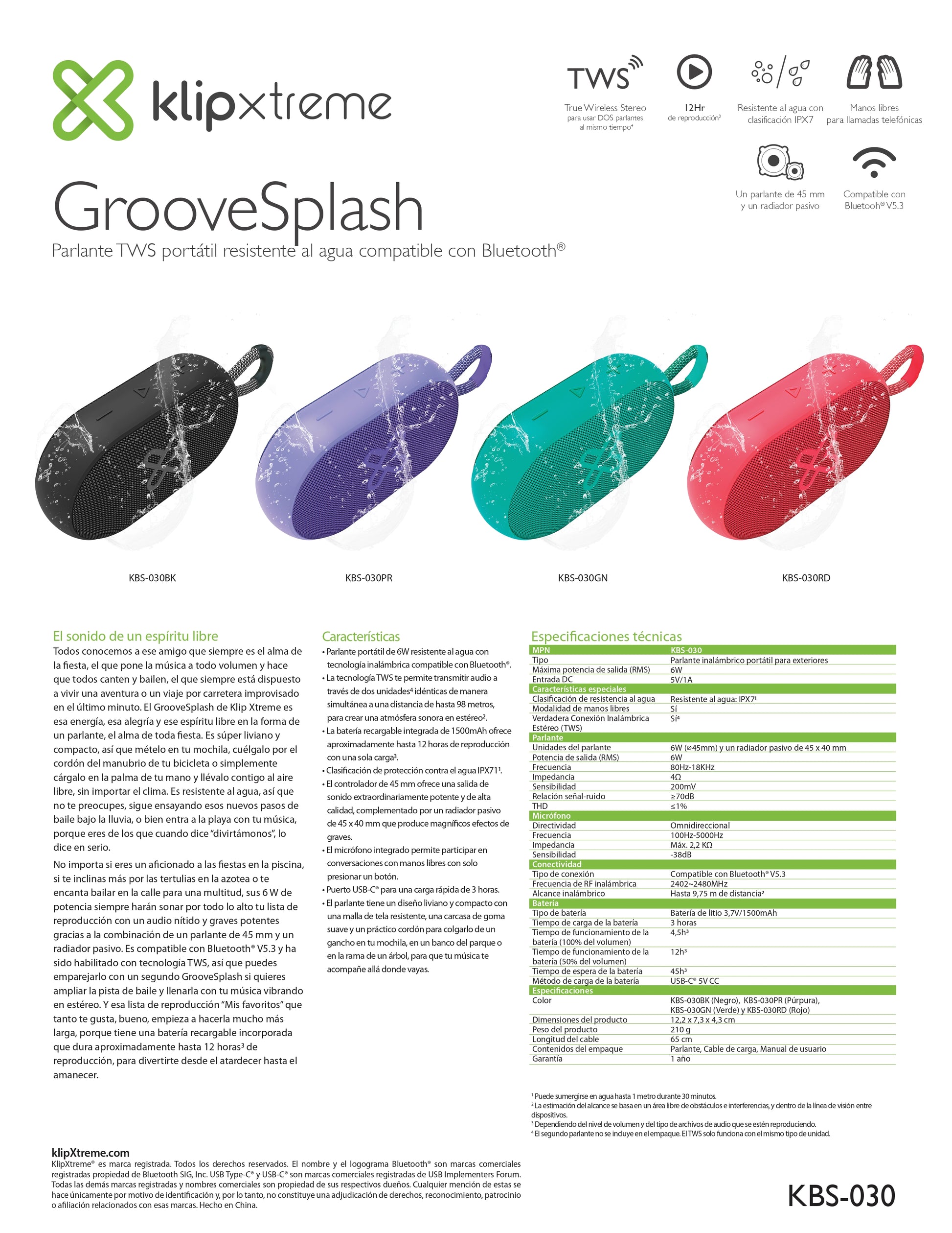 Disfruta de un sonido claro y potente con el altavoz inalámbrico Klip Xtreme KBS-030GN. Su diseño resistente con certificación IPX7 garantiza protección contra agua, ideal para uso en exteriores. Con hasta 12 horas de reproducción continua y tecnología TWS, permite conectar dos altavoces para una experiencia estéreo envolvente. Incluye micrófono integrado para llamadas manos libres y se presenta en un vibrante color verde. Perfecto para quienes buscan calidad y versatilidad en audio portátil.